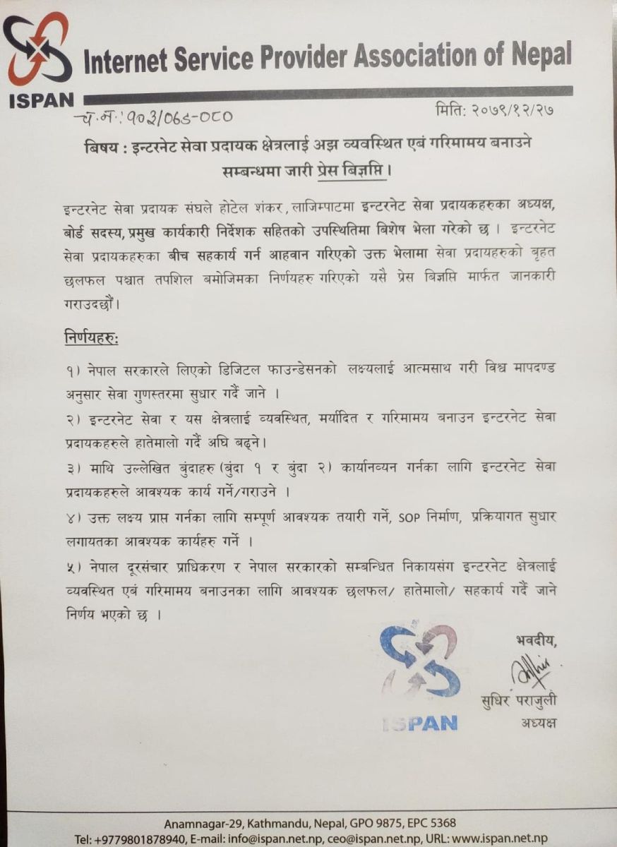 Similarly, it has been decided to hold necessary discussion/handshake/collaboration with the Nepal Telecommunication Authority and the relevant agencies of the Government of Nepal to make the internet sector orderly and dignified.