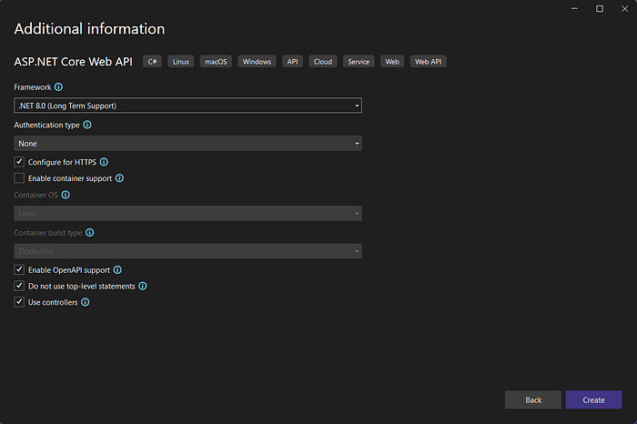 Recommended configuration for a new .NET 8 ASP.NET Core Web API project.