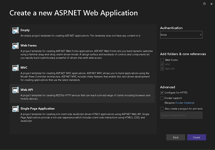 Select Web API (enable Configure for HTTPS) to create a secure RESTful service
