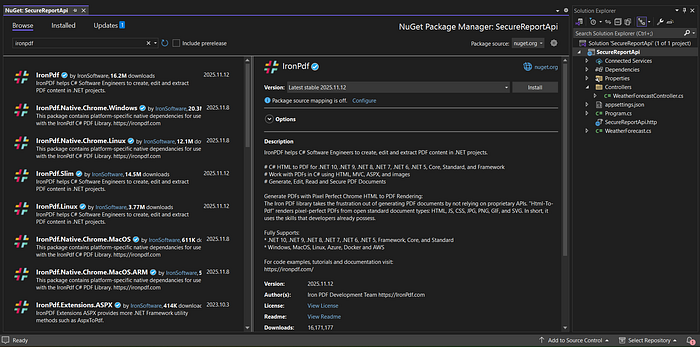 Install-Package IronPdfThis will download the IronPDF engine and all necessary dependencies (like System.Drawing.Common) into your project.