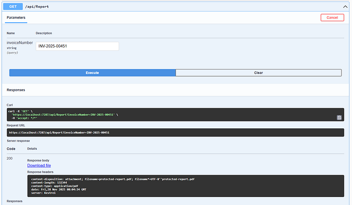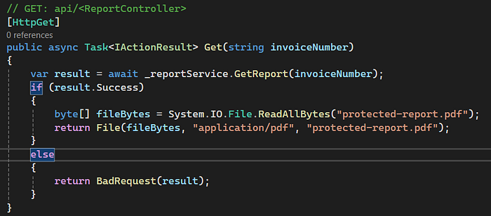 This code snippet from an ASP.NET Core ReportController demonstrates an asynchronous GET method that fetches a report using an invoice number. If successful, it reads and returns a static PDF file named “protected-report.pdf”; otherwise, it sends a bad request response. Ideal for illustrating simple file serving in web APIs.