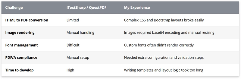 Here’s what I struggled with using open-source tools like iTextSharp and QuestPDF: