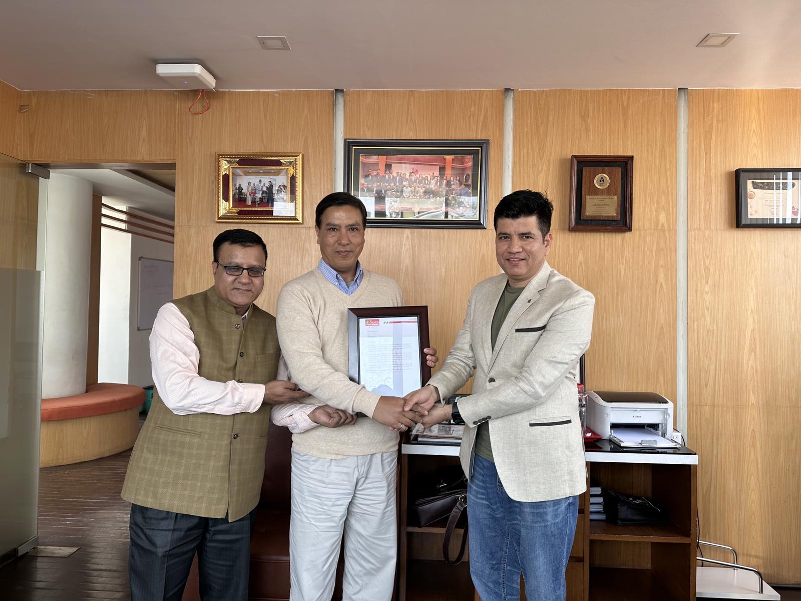 Ajesh Koirala, Chief Executive Officer of Iseva Money Transfer, handed over CG65 AE 4K UHG Android TV and stationery items to President Pramesh KC and General Secretary Sanket Koirala on Friday during a program for digital literacy.