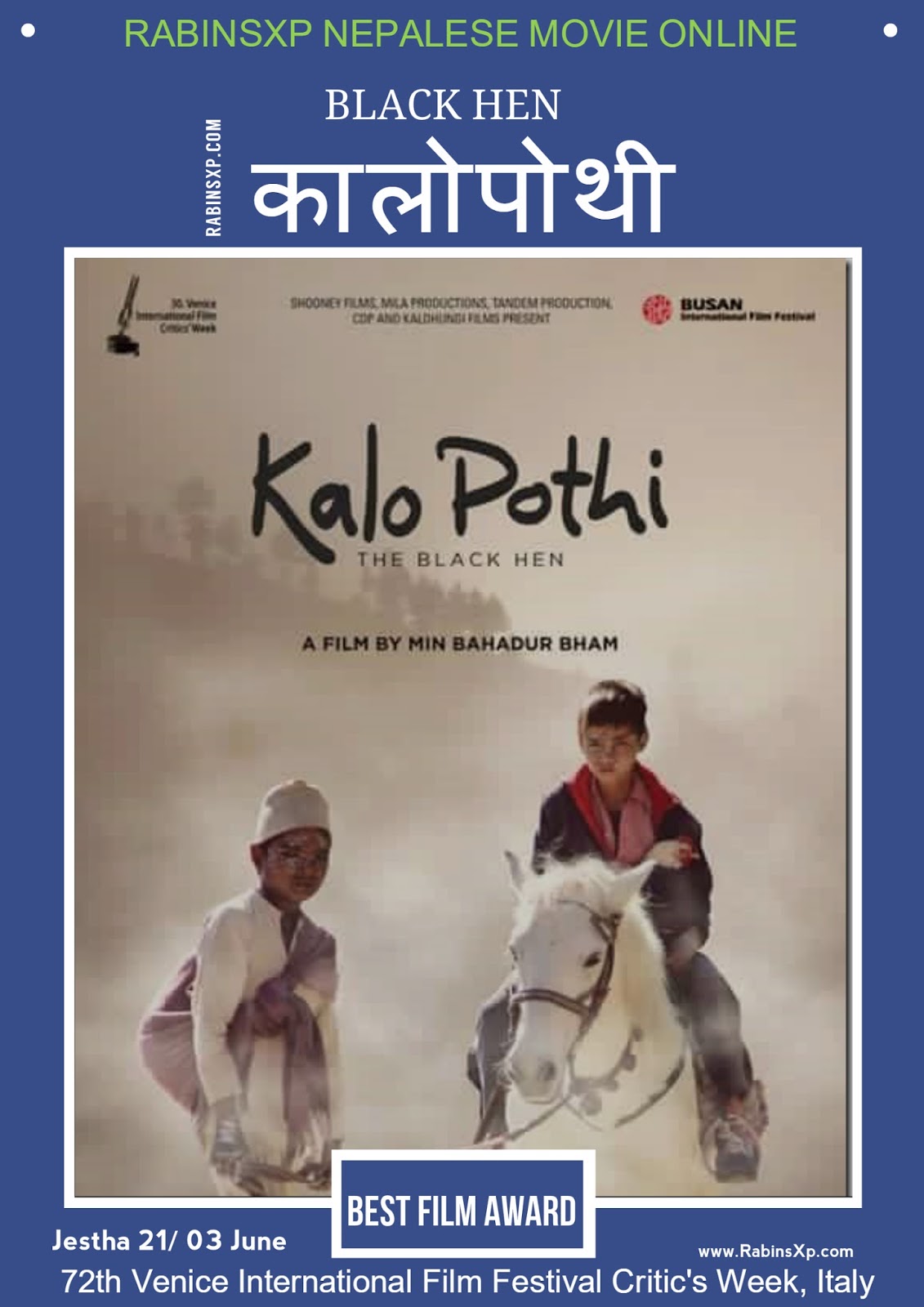 Kalo Pothi aka The Black Hen is a Nepalese feature film with the story of a time, situation, and an environment and awarded with BEST FILM AWARD in 72th Venice International Film Festival Critic’s Week (Italy) and nominated in many other international movie events. The film is co-production of Nepal, Germany, Switzerland and France with the production companies Mila Productions (Nepal), Shooney Films (Nepal), Kaldhungi Films (Nepal), Tandem Production (Germany) and CDP (France). The movie is starring with Khadka Raj Nepali, Sukraj Rokaya, Jit Bahadur Malla, Benisha Hamal, Khadka, Nanda Prashad Khatri, Bipin Karki and Pravin Khatiwada.