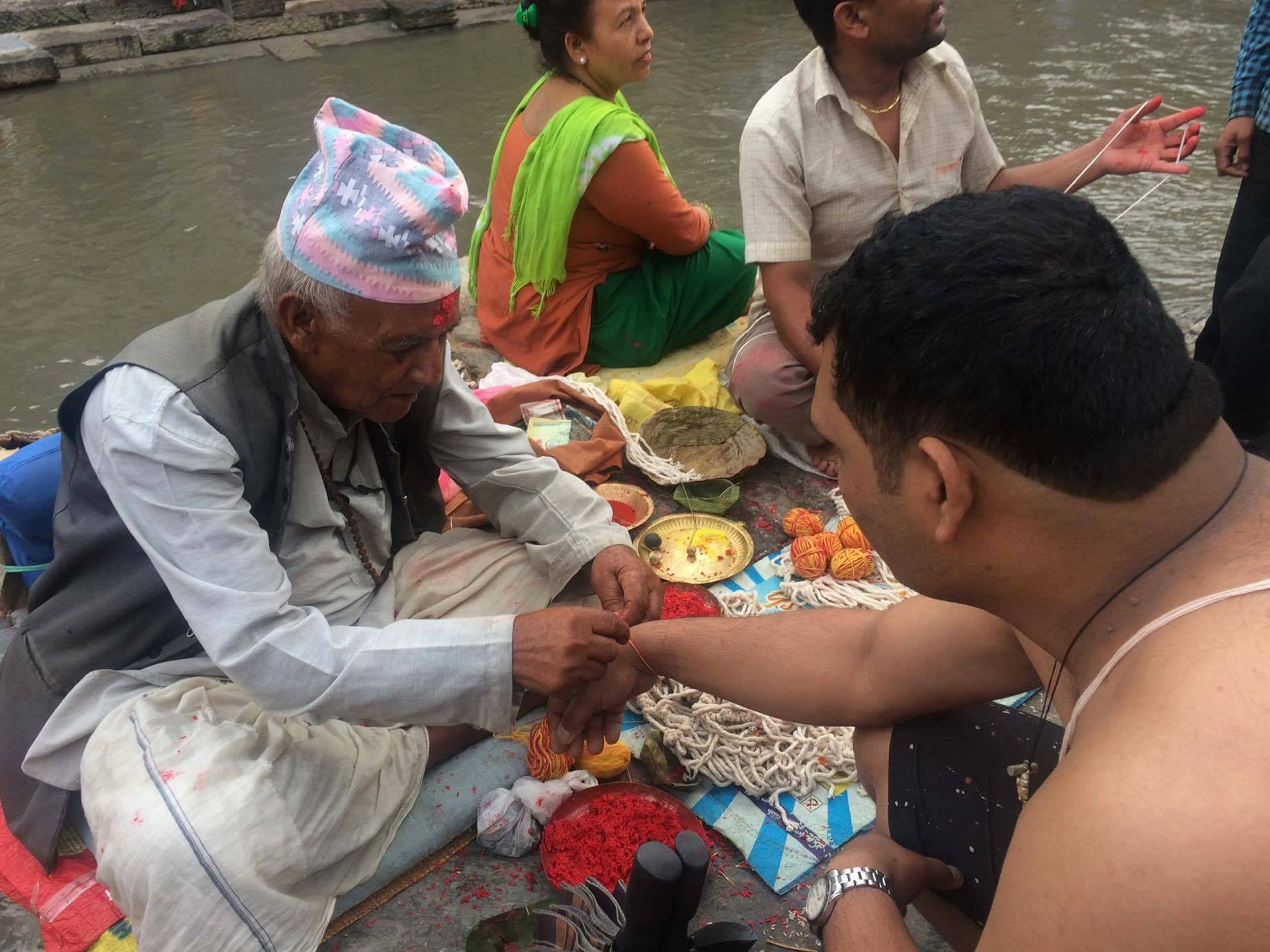 A Guru Brahmin binds a holy thread on wrist before giving him the holy thread for body known as Janai / Pic: Rasil Adhikari